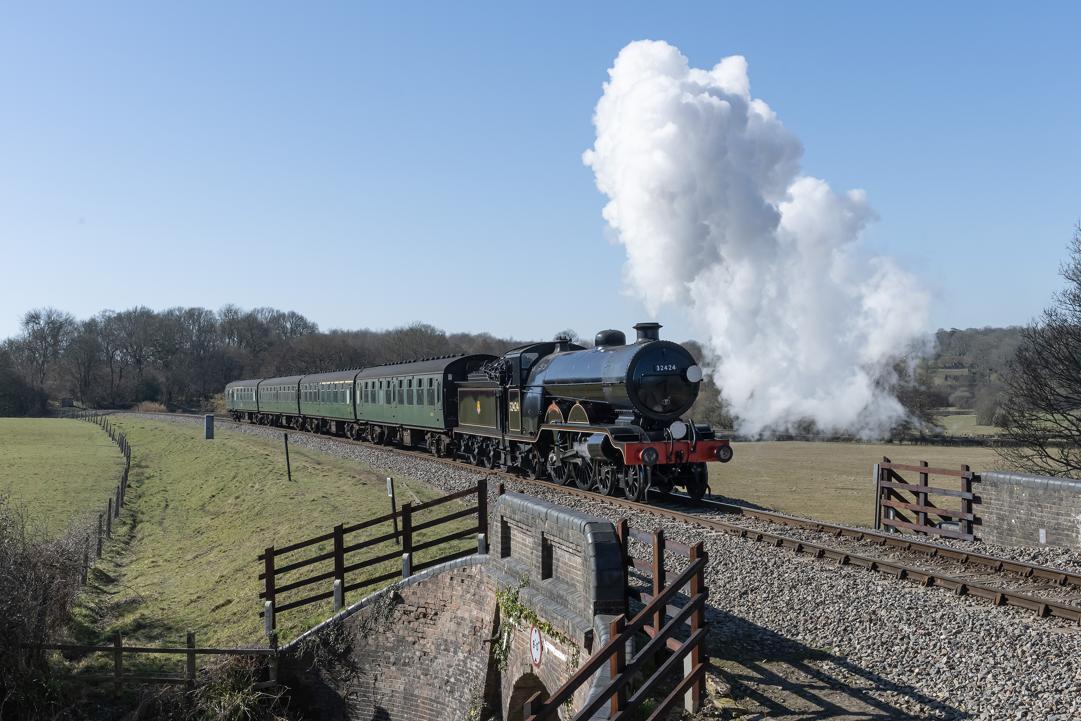 During a crystal clear March 2025 photo charter on the Bluebell Heritage Railway, new build LBSCR H2 4-4-2 Atlantic 32424 "Beachy Head" approaches Horstead Keynes with a northbound train of 4 BR MK1 coaches in Southern Region green livery. The loco is a huge achievement of the Bluebell and the Bluebell Atlantic Group. Go to: https://www.bluebell-railway.co.uk/bluebell/locos/atlantic for more information .