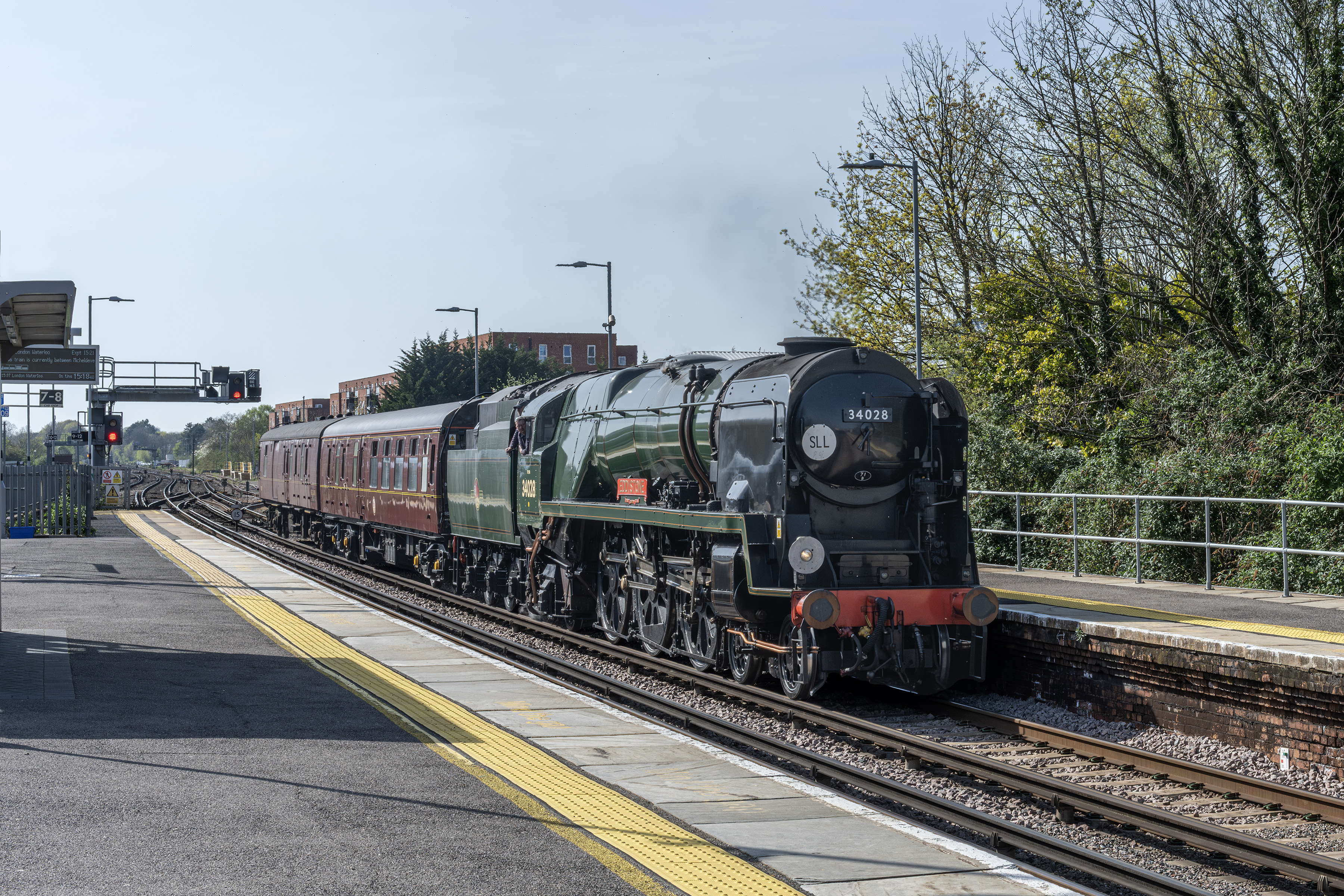 During April 8th, displaying its owner Southern Locomotives Ltd headcode, Bulleid West Country Class 4-6-2 34028 "Eddystone" drifts through Basingstoke with 5Z30 Swanage to Southall. Photograph by Andy Fewster.